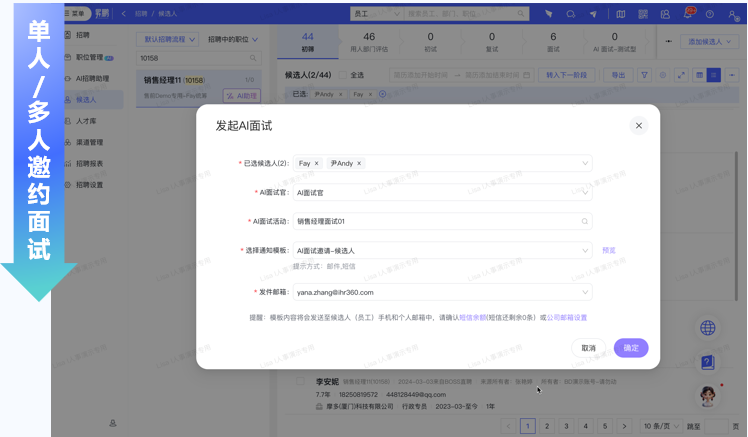 告别繁琐的电话和邮件轰炸,AI面试官支持HR向单人或多人批量发起面试邀请。
